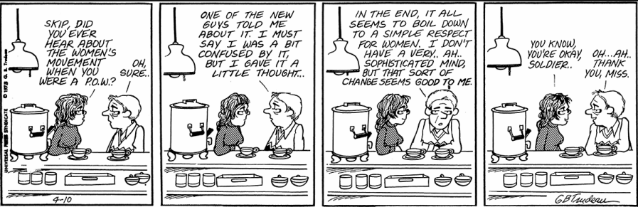 And yet, while he is profoundly out-of-touch with aspects of the new culture, Skip is remarkably in tune with new ideas that took root among young people during his absence. While he stumbles at first, with a clumsy assumption about gender roles at Walden Commune, he’s come to understand that the women’s movement “seems to boil down to simple respect for women” That sort of change,” he reasons,” “seems good.” Moreover, and much to the chagrin of his fellow vet B.D., he thinks that Zonker represents a new generation of “free thinkers … who give the rest of society a basis for some kind of hope and faith for the future.”