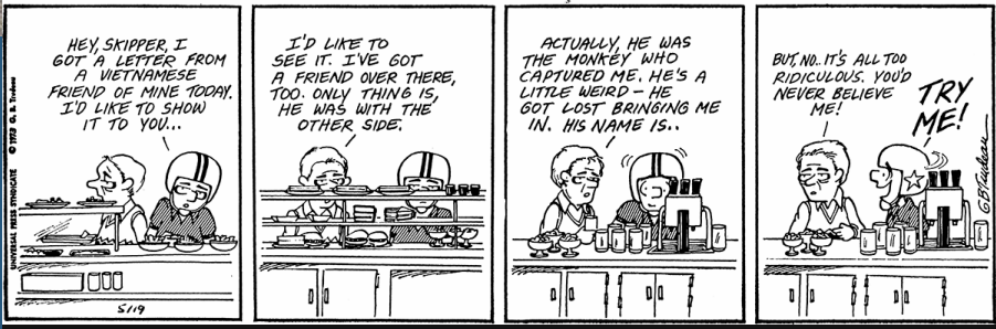 As I’ve written previously, an important shift in how Garry Trudeau wrote about American soldiers came as he began to write directly about the war. In a series of strips about B.D.’s ROTC training, Trudeau portrayed our hero – and by extension, the American military – as a psychopathic killer. However, GBT’s portrayal of the American military shifted when B.D. got to Vietnam: Trudeau largely abandoned dark satire for an approach that couched his criticism of the war in a more lighthearted style of humour. When B.D. was in-country, nobody died; the only injury of note was B.D. cutting himself on a beer can. Trudeau did return to a darker style with his strips about the Heartless Air Pirates, the airmen who dropped the bombs that killed millions Vietnamese and Cambodians, but even then, the Heartless Air Pirates were more clueless cogs in a machine than they were evil “baby-killers.” It’s clear that the more GBT wrote about the war, the more he understood that the real bad guys weren’t the individual soldiers, they were the generals and politicians who sent them to a cruel and ultimately futile war.