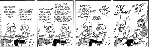 On 27 January 1973, representatives from the United States, South Vietnam, North Vietnam and the Provisional Government of the Republic of South Vietnam signed the Paris Peace Accords, ending direct American military involvement in Vietnam. As part of the agreement, North Vietnam began releasing American prisoners of war, some of whom had been held since 1964. A little over two months later, GBT introduced us to Skip Willis, a twenty-six-year-old Walden College freshman at who had spent the previous seven years in a Vietnamese POW camp. (Skip, like B.D. owes his capture to a certain goodhearted, though incompetent, Vietcong terrorist.)