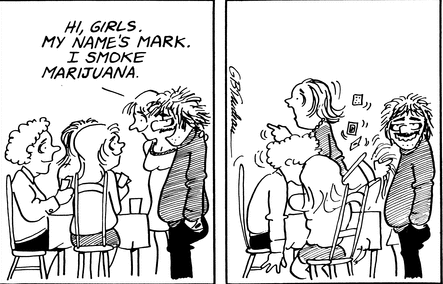 The earliest Doonesbury strips about weed employed a softer version of the drug humour that drove strips like Gilbert Shelton’s Fabulous Furry Freak Brothers, featuring gags that rejoiced in the silliness of getting stoned or that poked fun at squares who hadn’t turned on. GBT’s first strip about cannabis, which ran on April 12, 1971, could have run in one of the underground comix of the time. Mark offers Mike, who is reading a copy of Playboy, a cigarette: when a bikini-clad woman materializes out of the pages of his magazine, Mike quickly figures out that he hasn’t been smoking tobacco. Not a great strip, but certainly one that pushed the boundaries of the family funny pages. Other early strips made conservative revulsion and paranoia about grass the butt of the joke. Two classic strips from 1971 illustrate this: On 17 August, 1971, Mark introduces himself to his mother’s bridge club, saying “My name’s Mark. I smoke marijuana,” grinning as pandemonium ensues among the uptight suburban housewives. Soon after Zonker was introduced to readers, B.D. busted his new “uptight end” smoking “the dreaded killer marijuana” during football practice. B.D. reacted by informing Zonker that the “evil weed” led to “COMMUNISM!”