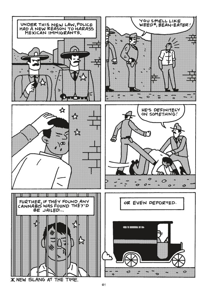 The revulsion towards marijuana displayed by B.D. and Mark’s mother’s bridge friends becomes dangerous when it’s backed up by the power of the state. The vilification of marijuana and the use of the law, police, and the prison system to punish its users is the subject of Box Brown’s recent work of comics history, Cannabis: The Illegalization of Weed in America. The book begins with a brief look at the effects of marijuana, a glimpse at Hindu mythology about its origins, and a look at how British colonial officials in India attempted to control the drug. Brown then brings us to the New World, where the hemp plant arrived in 1528 with Herman Cortes. The industrial hemp which he brought with him for the purposes of growing fibre for ropes, paper, and cloth was eventually re-purposed by people who enjoyed smoking its flowering buds. By the middle of the 19th century, smoking cannabis had become popular in Mexico, and extracts from the plant could also be found in patent medicines in the United States. Brown then traces how Americans’ real love affair with marijuana began in the first decades of the 20th century, when the Mexican Revolution drove refugees into the United States, bringing cannabis culture with them. Mexican-Americans forged social links with African-American communities, facilitating the spread of marijuana’s popularity in the United States, notably because of weed’s popularity among jazz musicians in New Orleans.