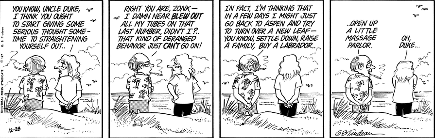 Yet even as Trudeau satirizes Hunter Thompson’s character and work, he gives us a glimpse at what Duke would become: a pathetic hustler with no regard for his fellow humans, and, as such, a stand-in for American moral corruption. When Zonker suggests that Duke think about straightening out, Duke agrees, laying out an idyllic vision of a future life: “I might just go back to Aspen … settle down, raise a family, buy a Labrador,” and “open up a little massage parlor.” In Duke’s eyes, there is no line dividing what is generally framed as “good” in America – pristine landscapes, dedication to family, stability – from a darker, amoral America where getting ahead by taking advantage of others is the only way to go.
