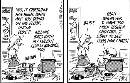 Readers’ first encounter with Duke came on 8 July 1974, when Zonker stops by the offices of Rolling Stone to visit his “uncle.” (Duke is not really related to Zonker: he’s an old family friend) Duke’s first appearances are little more than shout-outs to Thompson’s reputation as a hard-living writer. Introducing Duke, Trudeau directly references Thompson’s Fear and Loathing in Las Vegas, showing him under his desk, killing “huge hairy bats” that he hallucinates after consuming “too much tequila and coke.” (Fear and Loathing begins with Thompson seeing “huge bats, all swooping and diving around the car” as he drives across the desert in a drug-induced haze.) Subsequent early appearances reinforce Duke’s role as a parody of Thompsonian excess: he’s careless with firearms; he spends the weeks leading up to Christmas comatose after “[getting] into some particularly viscous hallucinogens over Thanksgiving”; upon awakening, he believes that Zonker is “a giant lizard.” Trudeau’s parody of Thompson is its harshest when he portrays Duke/Thompson as a hack writer with an amateur work ethic. Duke is so messed up that he misses his deadline for submitting “the finest, most savage article [he’d] ever cranked out,” a piece about his “shoplifting conviction” titled “Fear and Loathing at Macy’s Men’s Wear.” When he finally goes to submit the article to RS editor Jann Wenner, all he’s written is pages of gibberish.