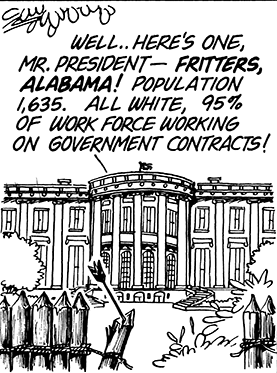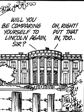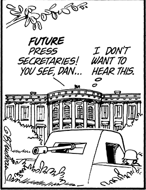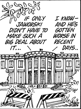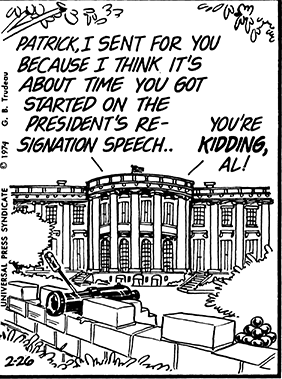 The 10 February 1974 Doonesbury strip begins with an unidentified White House employee building a “national security snow fort” in front of the White House. The snow fort becomes the foreground for a dialogue between Nixon and his confidant Bebe Rebozo about the former’s fears of being impeached. Two weeks later, the snow fort was replaced by sandbags and a machine gun emplacement; the next day, the White House was behind a store parapet equipped with cannons. Subsequent strips featured barbed-wire fences, fence posts reminiscent of an Old West fort, an electrified fence, road construction barriers, a bamboo fence, a pillbox, a tank, soldiers digging trenches, more sandbags and machine guns, a wooden fence, and, ultimately, a stone wall.