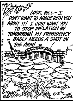 Trudeau’s decision to steer Doonesbury in a more explicitly political direction had a couple of effects on how his work was received. It eventually led to some papers (starting with the Lincoln Journal in 1973) running Doonesbury on the editorial/op-ed pages instead of the funny pages. Trudeau’s political work won him the Pulitzer Prize for editorial cartooning in 1975.