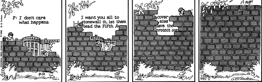 It is unlikely that the current process will end, as it did in 1974, with a symbolic wall coming down – the Senate majority leader has made it clear that the fix is in. There are other significant differences between Nixon’s era and Trump’s that come through reading the strips that surrounded Trudeau’s Watergate work.