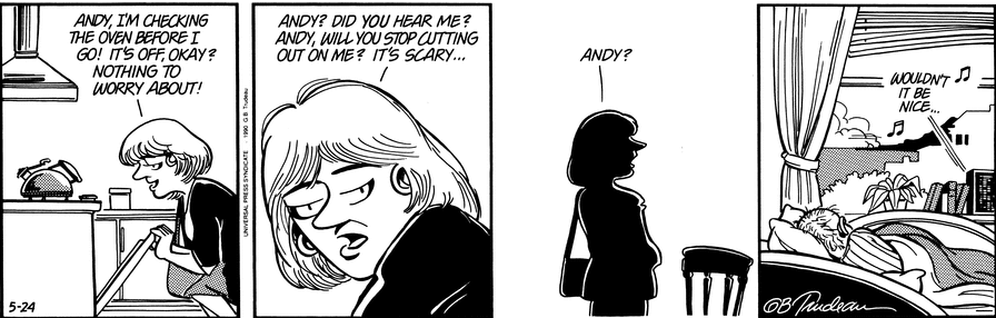 If Dick showed us that death is the price of a good life, Doonesbury’s next death reminded us that sometimes people are taken away for no good reason. In 1990, Joanie’s close friend Andy Lippincott died of HIV/AIDS. Andy’s is the only Doonesbury death that could rightly be described as tragic, because he died young, and because those who had the disease that killed him were scorned by American society and the American government for far too long. Readers learned of Andy’s illness in April 1989. A year later, Andy was preparing for his funeral, a process that revealed how humour can be an effective tool for those facing unspeakable tragedy. Andy requested that the cast of Cheers act as his pallbearers; he told corny jokes about AIDS patients. While Joanie didn’t understand how Andy could joke about his fate, his doctor and perpetual straight man pointed out that to live with AIDS was to live with anger at how the disease represented a “stigma on top of a stigma.” Andy’s joking helped him “soften the rage he [felt] and … face the abyss.” Andy died on 24 May 1990. As tragic as Andy’s death was, GBT gave the moment poetic beauty. The Beach Boy’s Pet Sounds – one of Andy’s favourite albums – had just come out on CD and Andy, after marvelling at the sound of the recording, drifted away peacefully, listening to his favourite band, “Wouldn’t It Be Nice” playing on his stereo.