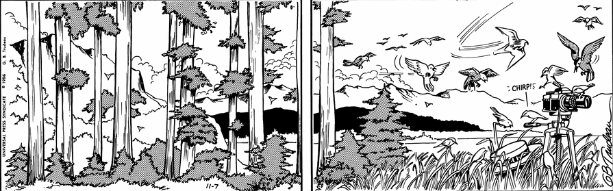 In 1986, Dick Davenport, the ornithologist and husband of Representative Lacey Davenport, died while trying to catch a view of the elusive Bachman’s warbler, a bird now believed to be extinct. Dick’s heart gave out just as he was about to snap a photograph of the rare bird: he made a deal with God and survived long enough to click the shutter and gain his own type of “immortality.” Trudeau told the story in a way that softened the impact of the strip’s first death. Dick’s stoic acceptance of his fate – he lay on the ground thinking “Well, great. A massive coronary” – revealed a man who’d had a good run and understood the inevitability of death. A two-panel wordless strip – one of my favourite examples of GBT’s generally-underrated drawing skills – captured the beauty that can be hidden in death. In the foreground of a forest scene, we see Dick’s trademark straw boater sticking out of the grass. Birds of various species perch on Dick’s camera in tribute to a kindred spirit.