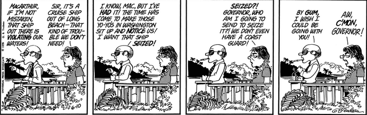 Duke returns to Pago-Pago after American Samoa’s Minister of Ecology discovers oil off the colony’s shores. The discovery brought Jim Andrews, the president of Universal Petroleum to American Samoa. Andrews, who is named for the founder of Universal Press Syndicate (now Andrews McMeel Syndication), the company that distributed Doonesbury, often appeared in the strip when corporate culture or the politics of oil were the topic.