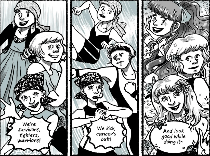 Even once we are functionally “cured,” cancer patients can be left with long-term after-effects from the procedures that saved their life. In my case, I use an ostomy bag and have acute numbness in my extremities, a side-effect from chemotherapy that limits my fine motor skills and has me walking with a cane because I’m unsteady on my feet. If Our Cancer Year is strongest when it focuses on the suffering induced by cancer treatments, some of Kimiko’Does Cancer’s most important insights are about how, for many of us, being declared cancer-free is not a finish line, but a milestone in a process that might last years, or the rest of our lives. Kimiko’s story focuses on her “new normal” of living with a hormone therapy regimen that will (hopefully) keep her cancer from recurring. The aftershocks of her treatment are bad enough that she asks herself if she “[has] a disability,” a question I struggle with: does what we live with count as being “disabled” when “the discomfort is from medication?” As Kimiko observes, there is relative silence surrounding the after-effects of cancer treatment because “the mainstream cancer narrative is about overcoming adversity,” not about being left disabled.