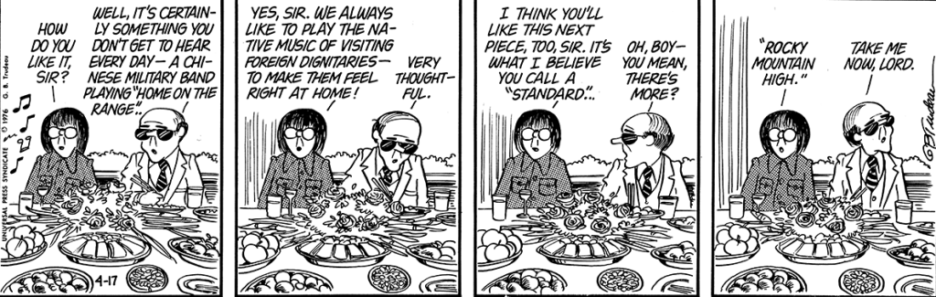 Something I haven’t mentioned is how Duke’s tenure as U.S. Ambassador to China grew out of Garry Trudeau’s experiences as a member of the press corps covering Gerald Ford’s 1975 trip to China. I have no evidence for this, but I’m guessing that the reference to “Rocky Mountain High” may well be recreating an episode from that trip. If you know better, please drop me a line.