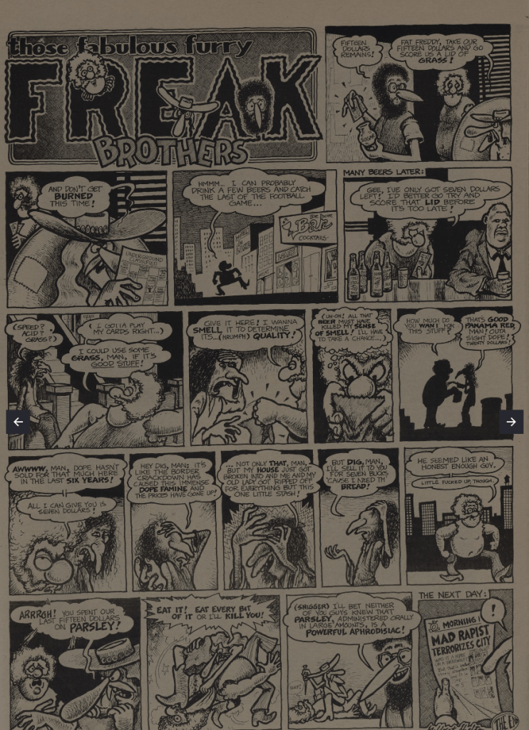 Underground comix can trace their roots through a tradition of radical print culture going back at least as far as the Transcendentalists (in the US-American context, at least: the global scope of alternative comics is something I still need to dig into); they and the newspapers which carried them often faced severe consequences for dealing in dangerous ideas. Next time in this series, we’ll look more closely at what was going on in the world of comic arts as the undergrounds took root. Stay tuned.
