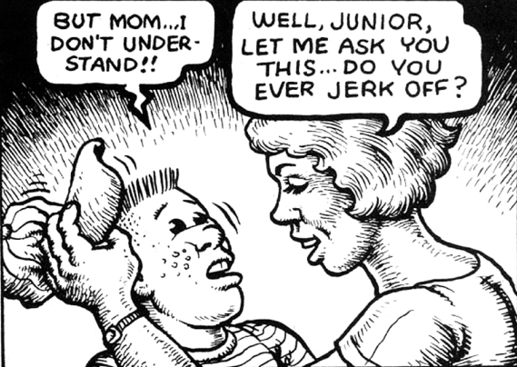 As difficult as it is to read “Joe Blow,” the images are meant to draw in the reader, hiding sheer horror behind the most innocent visual aesthetic. Comics historian Paul Buhle notes that the undergrounds were, besides a form of social satire,“a play or commentary on comic art forms.” They often borrowed heavily from the visual language of mainstream comics: evoking the “family-friendly” characters and situations that dominated the funny pages was, as Crumb saw it, a way to “promote breaking out of that culture in an ironic, humorous way.” Part of what makes “Joe Blow” such a profoundly disturbing – and effective – piece of satire is how it uses the cutest, friendliest drawing style (Crumb honed his illustration skills creating greeting cards for Hallmark) to illustrate profoundly disturbing situations that violate any socially-acceptable sense of sexual propriety: the same scenes rendered with a drawing style that evoked the horror and ugliness that lay at the heart of “Joe’s” family wouldn’t get the point across: the real ugliness isn’t in something outside of us – it’s woven into the fabric of our lives. That’s what makes it so horrifying.
