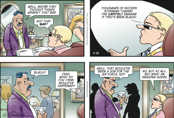 The strip begins with Earl, Duke’s son and partner in his political consulting operation, reading the January Sixth Report, astounded that “it took the Army all afternoon to deploy the Guard.” Trff Bmzklfrpz, the former dictator of Berzerkistan and Duke’s client, suggests that perhaps officials didn’t understand the gravity of the situation. Earl responds with the question of the moment: “Thousands of rioters storming towards the Capitol? Imagine if they’d been Black!”