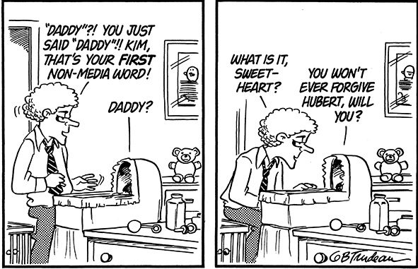 Baby Kim is one of my favorite occasional characters; I love how she balances political/cultural commentary and whimsy. Her attraction to Carter, I think, reflects the same dynamic beneath her fascination with McDonald’s commercials: a naive faith in America as a land of plenty, and of hope for the future. But as much as I have always loved her appearance as Jimmy Carter, the last strip in the arc frustrates the hell out of me, and has done for years. Frank is putting her to bed (“even front-runners have to get some sleep!”) and she says her “first non-media word”: “Daddy.” Frank’s joy is short-lived as his infant daughter slips back into her political incarnation: “You won’t ever forgive Hubert, will you?” About a month later, the line reappears: two reporters sit in a newsroom, contemplating a bet on an upcoming primary: “Twenty bucks says Humphrey takes it,” says one..” “Actually, I’ve forgiven him,” his colleague responds.
