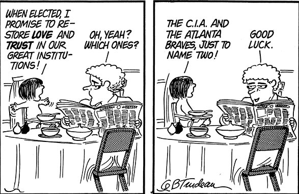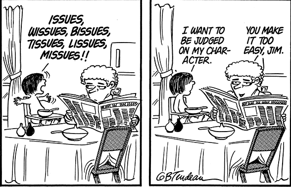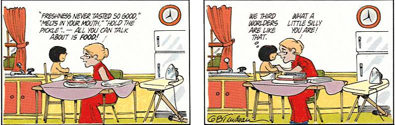 The first mention of Carter in a Doonesbury strip I found was from May 1976, in an arc featuring Kim Rosenthal (later Kim Doonesbury) and her adoptive father, Frank. Kim, the last orphaned refugee to leave Vietnam before the end of the war, learned to speak by repeating what she heard on television. Most of her early attempts at self-expression involved parrotting advertising slogans for fast-food chains – a reasonable obsession for “Third Worlders” like her – but during the 1976 primaries, Kim found a new voice to emulate, one that made her “the only Vietnamese orphan in L.A. with a Georgian accent.”