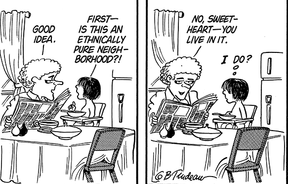 The scene is the Rosenthal breakfast table: Kim-as-Carter wants to talk housing, but first asks if she’s in an “ethnically pure neighborhood,” (she’s taken aback to discover that her very presence means that it isn’t.). In a later strip, she doubles down on her pledge to “keep big government out of our ethnically pure neighborhoods” and “put discrimination back in the hands of local authorities.” Like Carter, Kim is frustrated by a focus on complex “issues, wissues bissues lissues missues”; she would rather be “judged on [her] character.” Much like the candidate who seemed more comfortable dealing in lofty ideals than challenging policy specifics, Kim remained confident that “love and trust will keep out the alien groups.”
