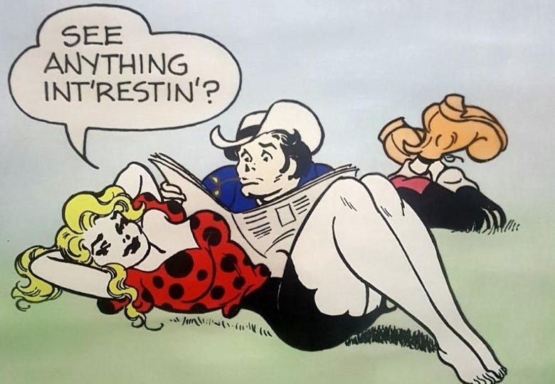 Crumb and his cohort were breaking new expressive and transgressive ground in comics arts, but smut has been part of the comics world for as long as the medium has existed. Even in the family-friendly confines of the daily funnies, there was precedent for the cartoon filth that Crumb et. al. were indulging in at the height of the sexual revolution, even if the naughty parts were more implied as compared to the raw explicitness of the comix era. Al Capp’s L’il Abner consistently challenged respectable bourgeois ideas about sex and marriage. While Trudeau doesn’t mention Sadie Hawkins Day, an annual event in which traditional gender roles regarding dating were overturned, in his look at the strip, he notes that the “shotgun marriage” of Li’l Abner and his longtime pursuer Daisy Mae, a highlight moment in 1950s American popular culture, marked “the culmination point of Capp’s satire on the ultimate aspiration of every American girl – to get married.” Capp’s cynicism about the virtues of marriage existed alongside a “lasciviousness” that permeated the strip. No popular cartoonist could match Capp’s ability to draw “cheesecake”/pin-up renderings of male or female bodies, but beneath that veneer of wholesome sexiness, the denizens of Dogpatch were into some freaky stuff. Trudeau sees characters like Moonbeam McSwine, “the dazzler who preferred hogs to men,” and Adam Lazonga, a “winner of loving cups in exhibitions of Dogpatch-style wooing the world over,” as evidence that, while Abner and Daisy’s marriage might have been “tame, almost anachronistic, by modern standards,” they and their neighbors were “still some way from being just plain folks.”