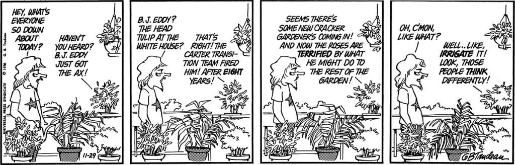 On 29 November 1976, Zonker dropped in on his houseplants, who were upset about a recent bit of news: Jimmy Carter’s transition team had fired B.J. Eddy, a “perennial’s perennial” with a reputation as “an aggressive, early bloomer,” from his role as White House lawn’s Head Tulip.