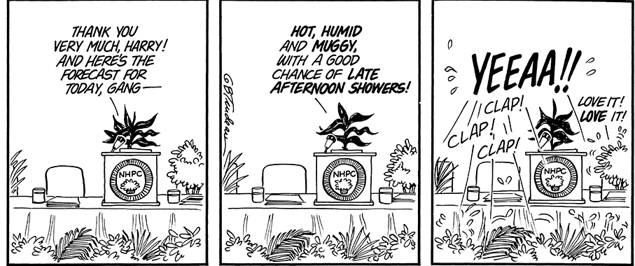 The convention arc hints at the possibility of doing something in a more topical vein with the trope of talking houseplants, but doesn’t deliver. The event’s keynote speaker was B.J. Eddy, the “Head Tulip from the White House lawn.” But B.J.’s only appearance in that sequence goes no deeper than a throwaway joke about banal convention speeches. Like the rest of the arc, it’s serviceably funny (though not as clever as the preceding installment, which sees attendees cheering the daily weather forecast – “Hot, humid and muggy, with a chance of late afternoon showers!”) but it doesn’t let Trudeau say much about affairs away from the comics page.