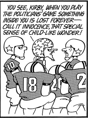 Zonker’s joy at being back on the field is tempered, however, by his worries about what his time in the cynical world of electoral politics may have done to him. “It’s exciting and glamorous,” he tells his teammate Kirby, “but that’s only part of the story”:
