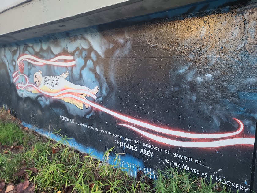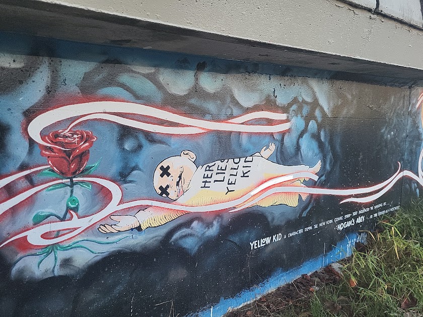 Activists have been working to raise Vancouver’s awareness of Hogan’s Alley’s place in our history, and thereby help restore the city’s memory of a community that was literally wiped off the map. Public art has been an important part of the process; there are a number of murals in the area where Hogan’s Alley stood paying homage to the neighborhood and its residents. The other day, as I walked underneath the Georgia Viaduct, one of the expressways that now stand where Hogan’s Alley once was, I encountered a mural which uses the image of the Yellow Kid with his eyes X’ed out as the starting point of an artistic exploration of a community that once thrived in that very spot.