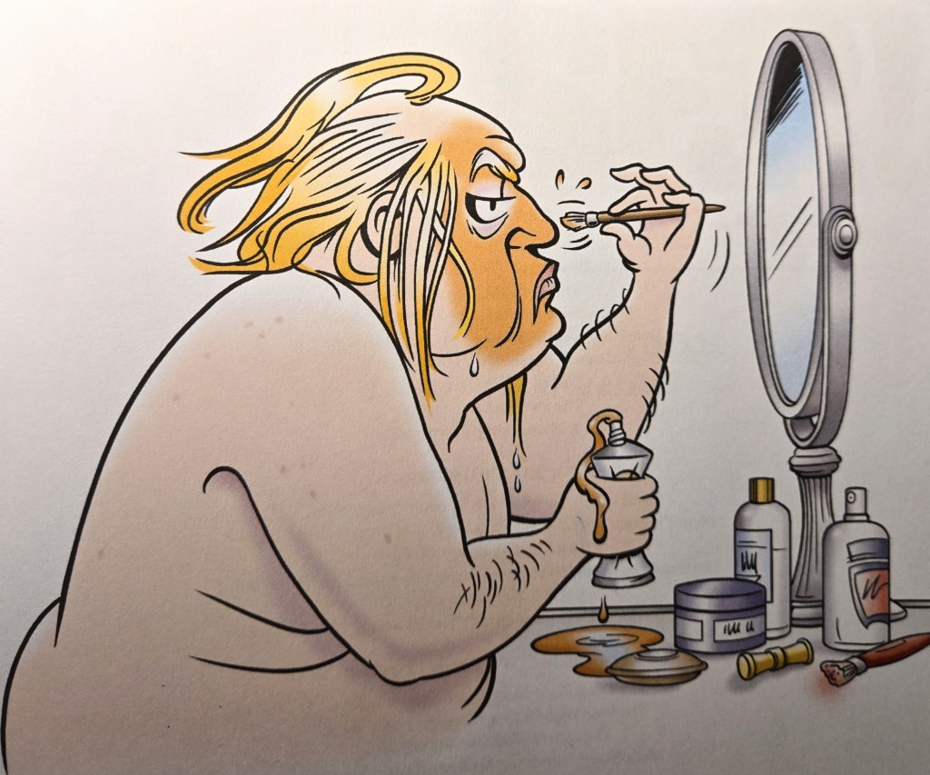 Initially, Trudeau’s renderings of Trump were fairly anodyne; the only change was in how he drew Trump a bit heavier as the man gained weight. In 2007, after Trump attacked talk-show host Rosie O’Donnel for her appearance, Trudeau began to focus on Trump’s own bizarre look with strips poking fun at his ridiculous hairstyle. From then, Trudeau’s depictions of Trump became increasingly grotesque. LEWSER!’s title page reveals Trump as a monster: heavily-made up, mostly bald, rolls of fat – he looks like a camp version of Dune’s Baron Harkonnen. When Trump’s incompetence led to the US having a COVID death rate substantially higher than in peer nations, Trudeau doubled down on his monstrous depictions of Trump by covering his hands in dripping blood.
