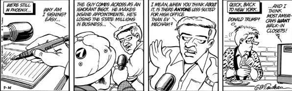 We get the answer to that question in the strip’s final panel: we jump “back to New York,” where Mike watches in disbelief as Donald Trump openly flirts –not for the last time – with the idea of running for president.