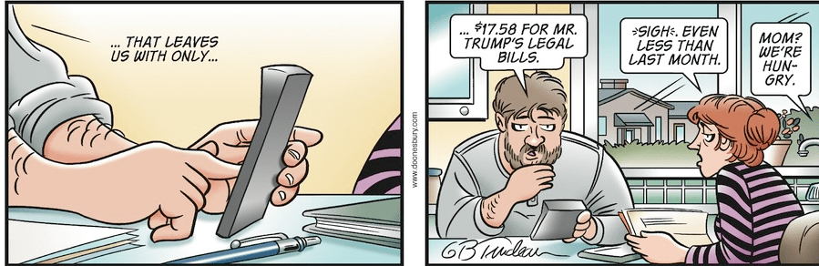 Four years later, with Trump facing trial for a truly astonishing number of state and federal felony indictments, Trudeau put readers at the kitchen table with a couple going through their bills. Their situation is bleak: he’s at risk of having his wages garnished by the IRS, so they’re going to skip the car payment this month; her tips will cover most of daycare, but the electric bill is overdue.
