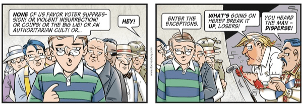 But even Doonesbury’s most reactionary and retrograde conservatives would not have fallen in line behind Trump. In a December 2021 strip, Mike, “a moderate Republican since college,” reminds readers that while many cast members are Republicans, including B.D., Dick and Lacey, Clyde, Jim Anderson, and Phil Slackmeyer, none of them – except for “a couple of minor exceptions” – “favor voter suppression! Or violent insurrection! Or coups! Or the Big Lie!”