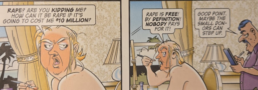 Trudeau has continued to remind readers that Trump is a rapist – the April 2024 strip mentioned above, in which Trump and Trff discuss his mental acuity, begins with Trump boasting about people congratulating him for having “normalized rape so beautifully” – but a recent strip about Trump’s history of sexual violence may have generated some backlash for the cartoonist.